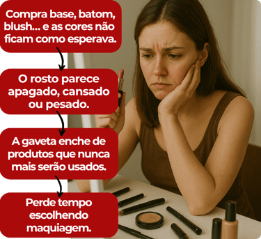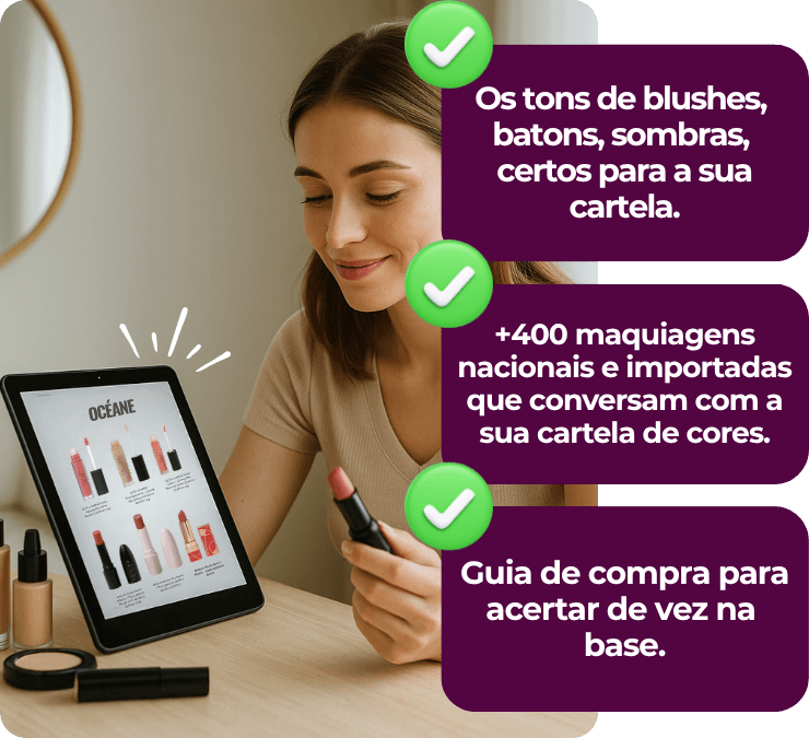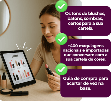 Foi aí que decidi criar o Guia Maquiagem na Cartela, reunindo 400 maquiagens aprovadas e alinhadas com cada cartela de cores, para que você não precise mais gastar tempo e dinheiro tentando adivinhar o que funciona.