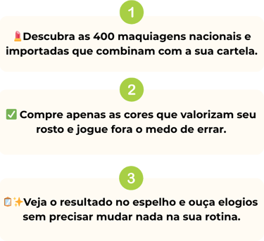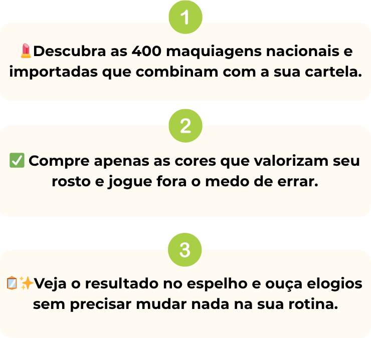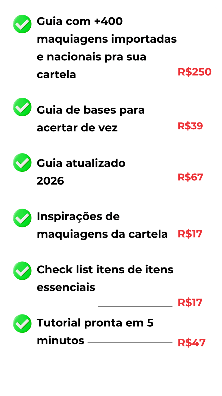 ✨ É simples, rápido e direto: você recebe o guia, segue a lista e acerta todas as suas maquiagens a partir de hoje.